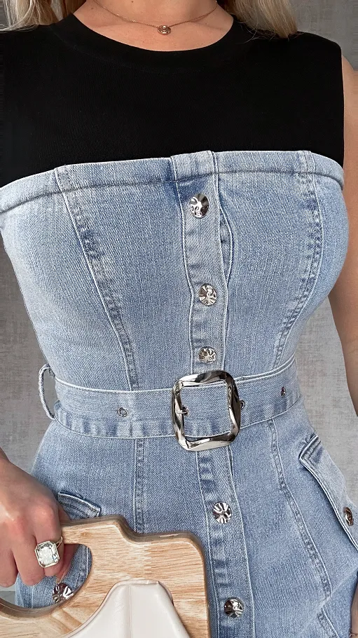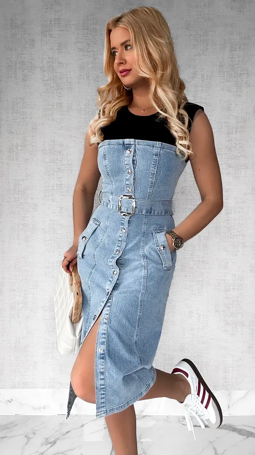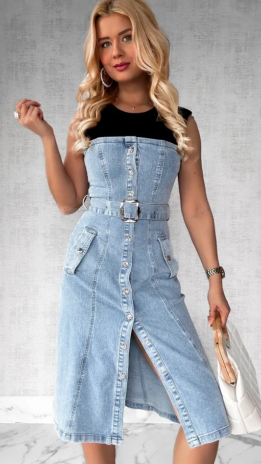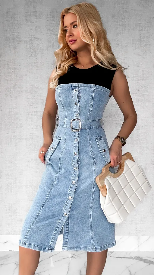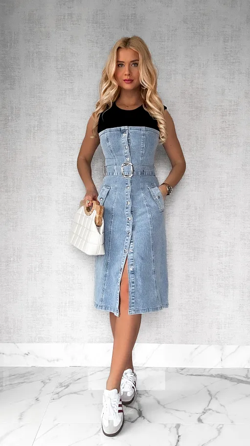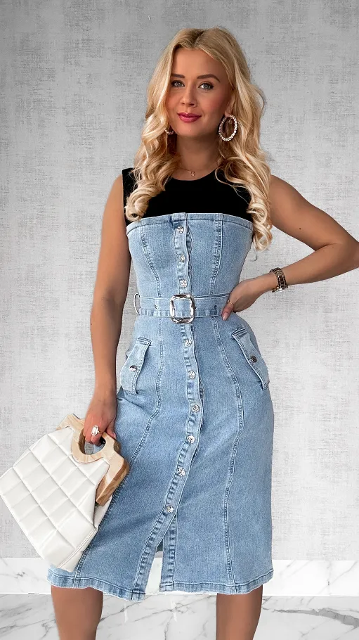 Ekstra sukienka jeansowa łączona z czarną bluzką w stylu t-shirt. Sukienka zapinana jest na butony co dodaje funkcjonalności, ma też pasek do stylizacji i jest elastyczna. Nie posiada rękawów, ma za to kieszenie a jej długość to MIDI. Sukienka jest wykonana z najwyższej jakości materiałów 95% bawełny oraz jest pięknie odszyta.